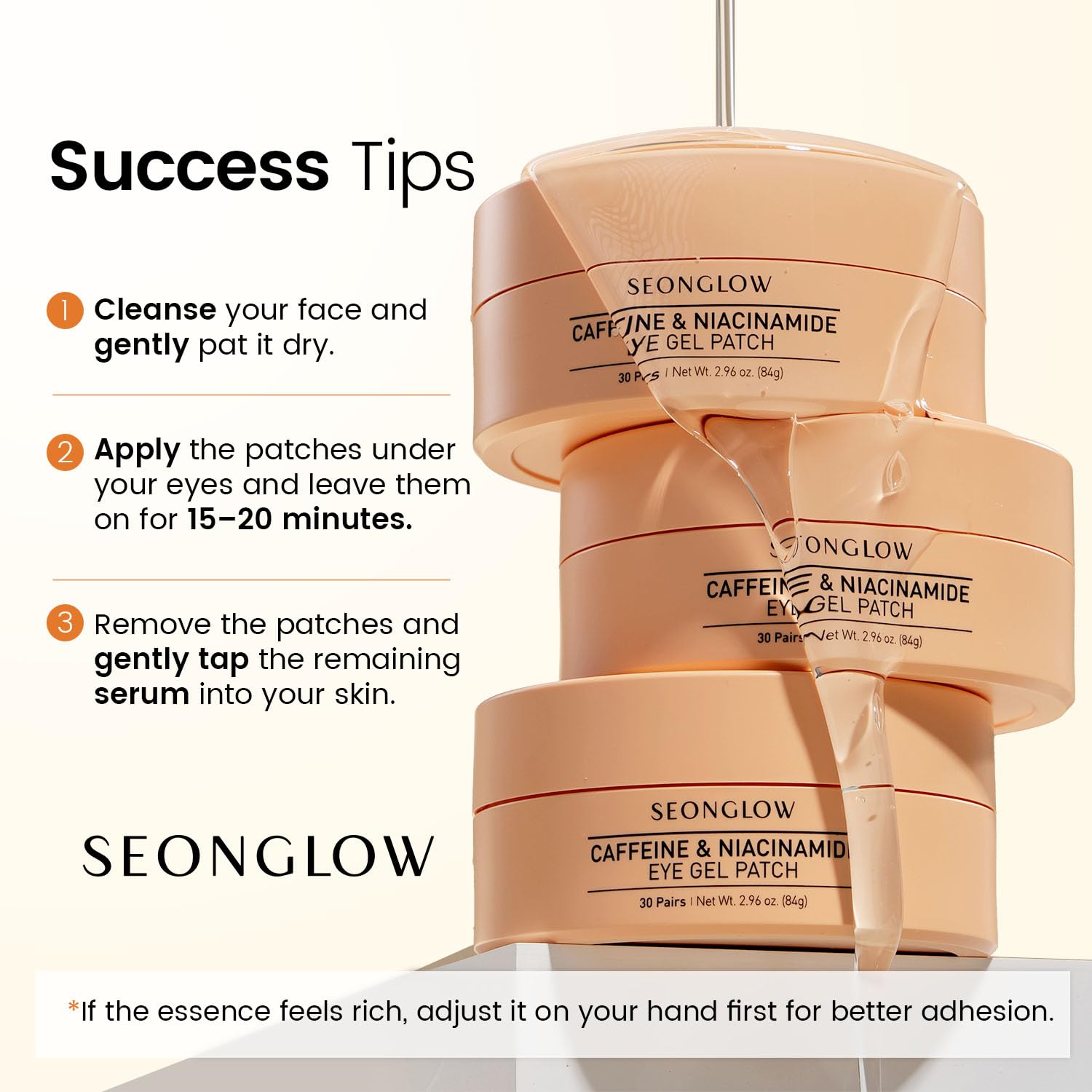 Say goodbye to tired-looking eyes with the SEONGLOW Caffeine Under Eye Patches. Infused with caffeine, niacinamide, and hyaluronic acid, these hydrogel patches target dark circles, puffiness, fine lines, and dryness, giving you instantly refreshed under-eyes.