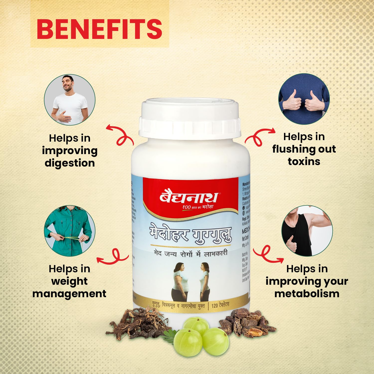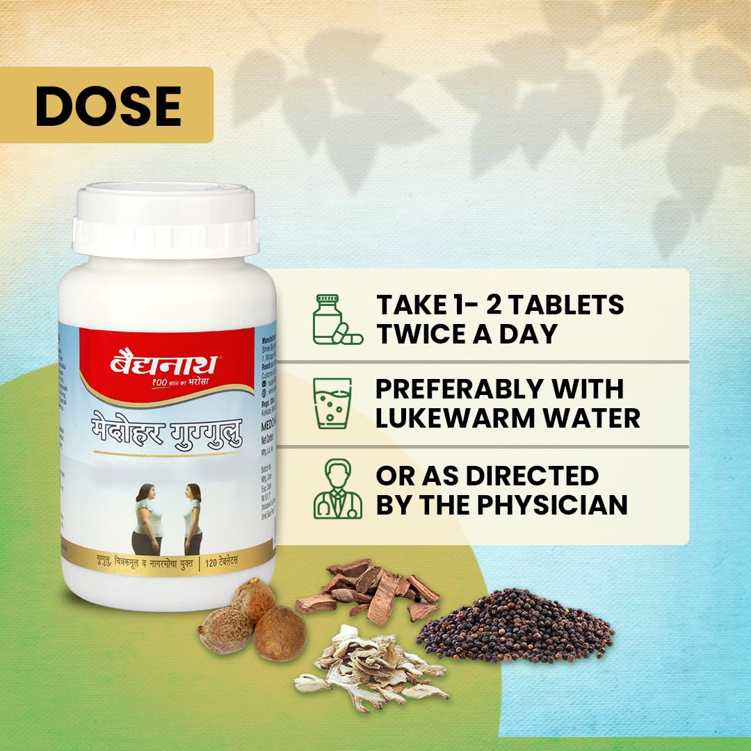 - Ayurvedic Weight Management: Baidyanath Medohar Guggulu Tablets are a trusted Ayurvedic formula designed to support healthy weight management. Enriched with potent herbs like Guggulu, Chitrakmool, and Nagarmotha, these tablets are a natural way to achieve your weight goals.