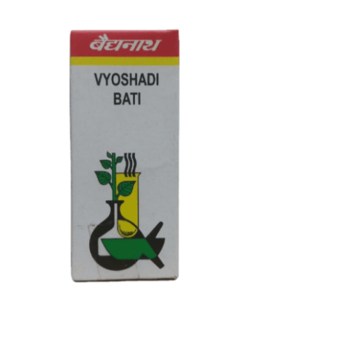 - Ayurvedic cold tablets, herbal cough relief, Baidyanath Vyoshadi Bati, allergy relief tablets, respiratory care medicine, natural decongestant, sore throat Ayurvedic remedy.