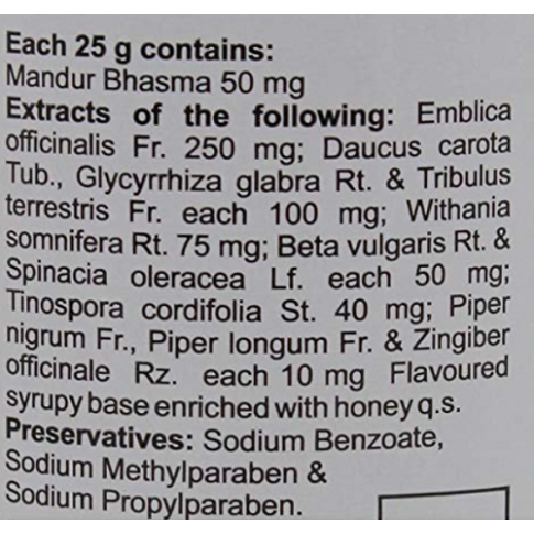 - Key Ingredients: Amalaki, Ashwagandha, Guduchi, Gokshur, Shunthi, Beetroot, Palak, Mandur Bhasma, Pippali, Honey
