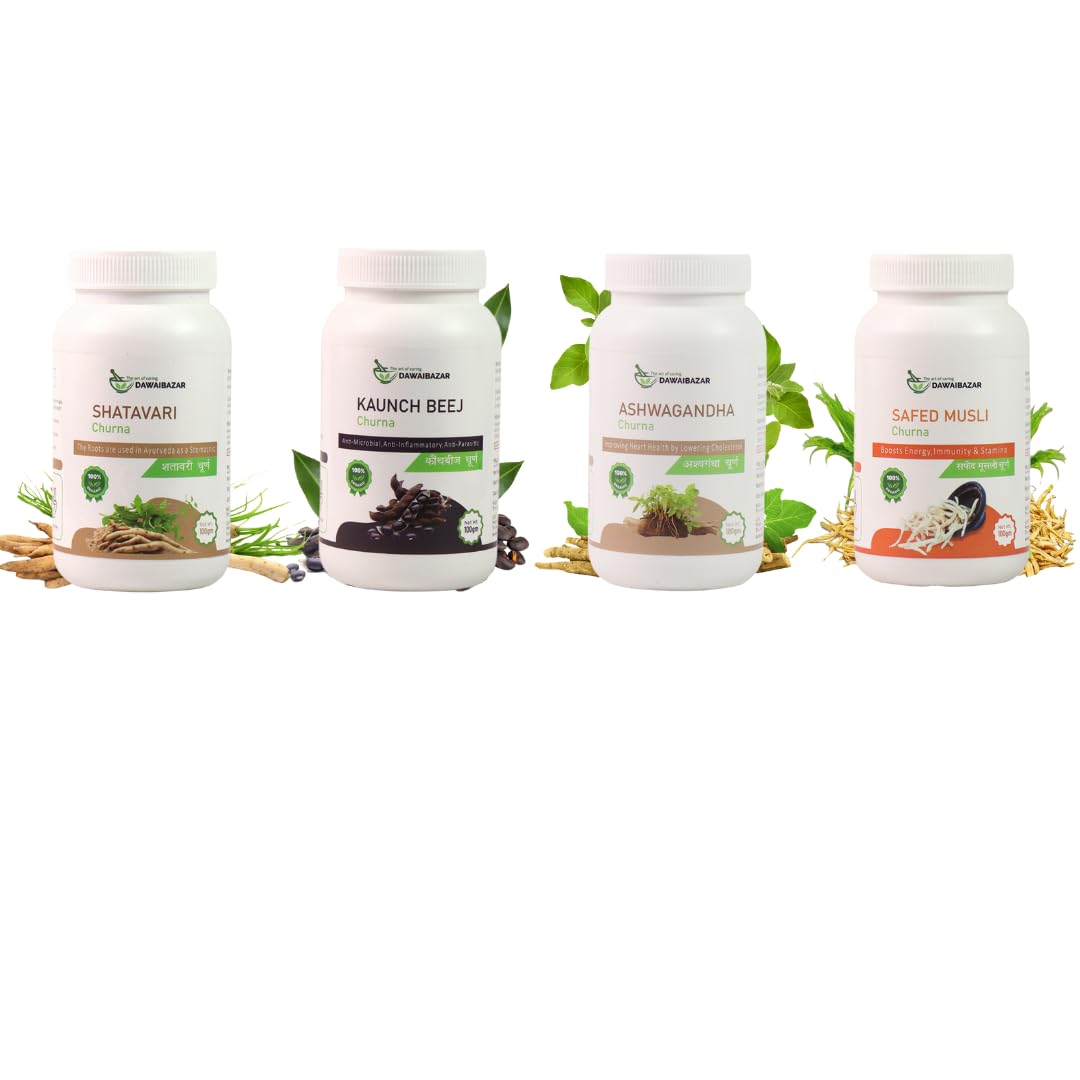 Dawaibazar Ayurvedic Churna Set – Shatavari, Kaunch Beej, Ashwagandha & Safed Musli (4 Bottles x 100g)