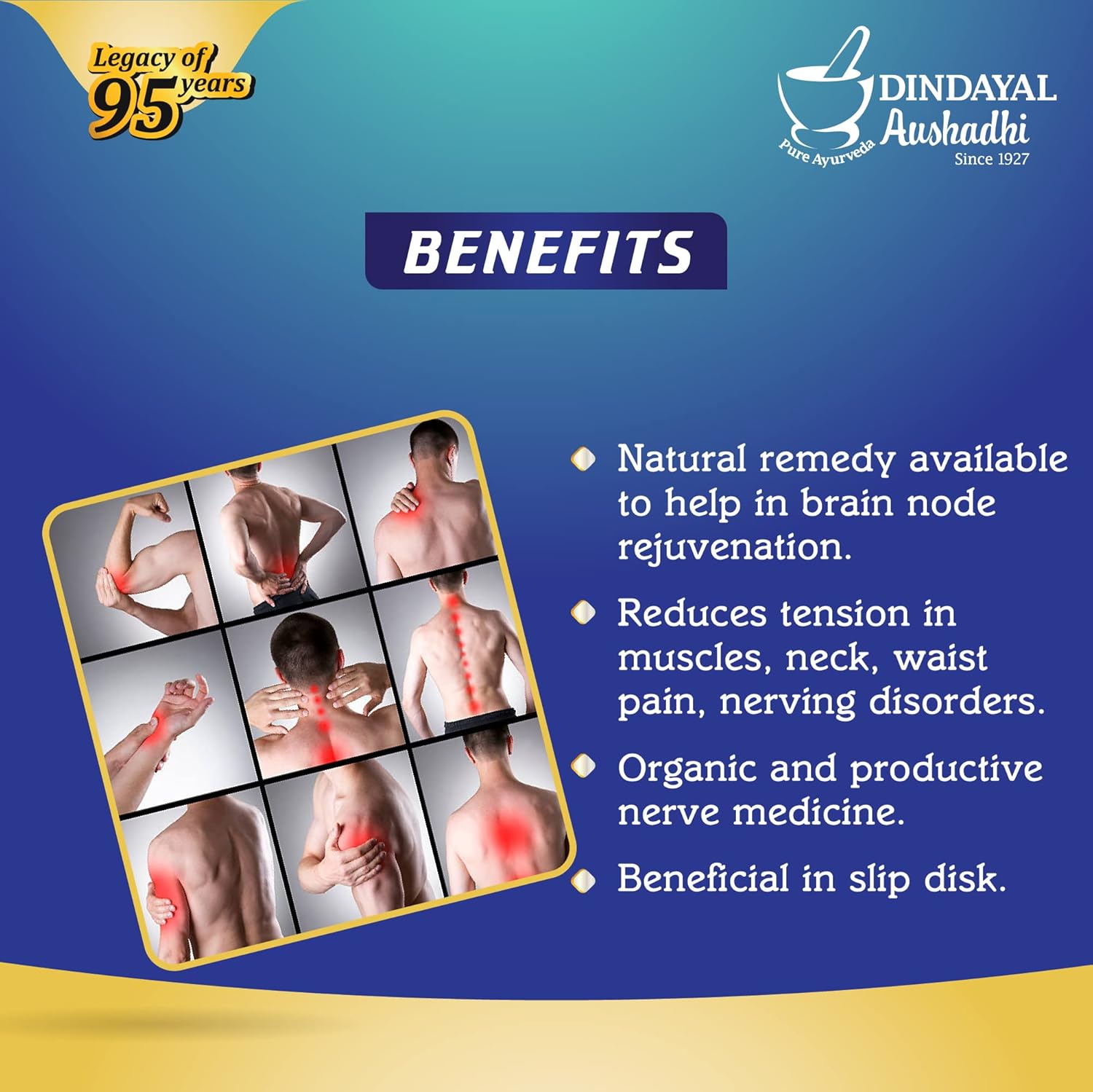 Find natural relief from nerve-related discomfort with Dindayal Nervcare Tablets, an authentic Ayurvedic blend that promotes nerve rejuvenation, brain health, and muscle relaxation. Enriched with time-tested herbs like Ashwagandha, Arjuna, Rasna, and Shilajeet, this herbal supplement supports your nervous system and helps ease conditions like spondylitis, slip disc, paralysis, and nerve tension.
