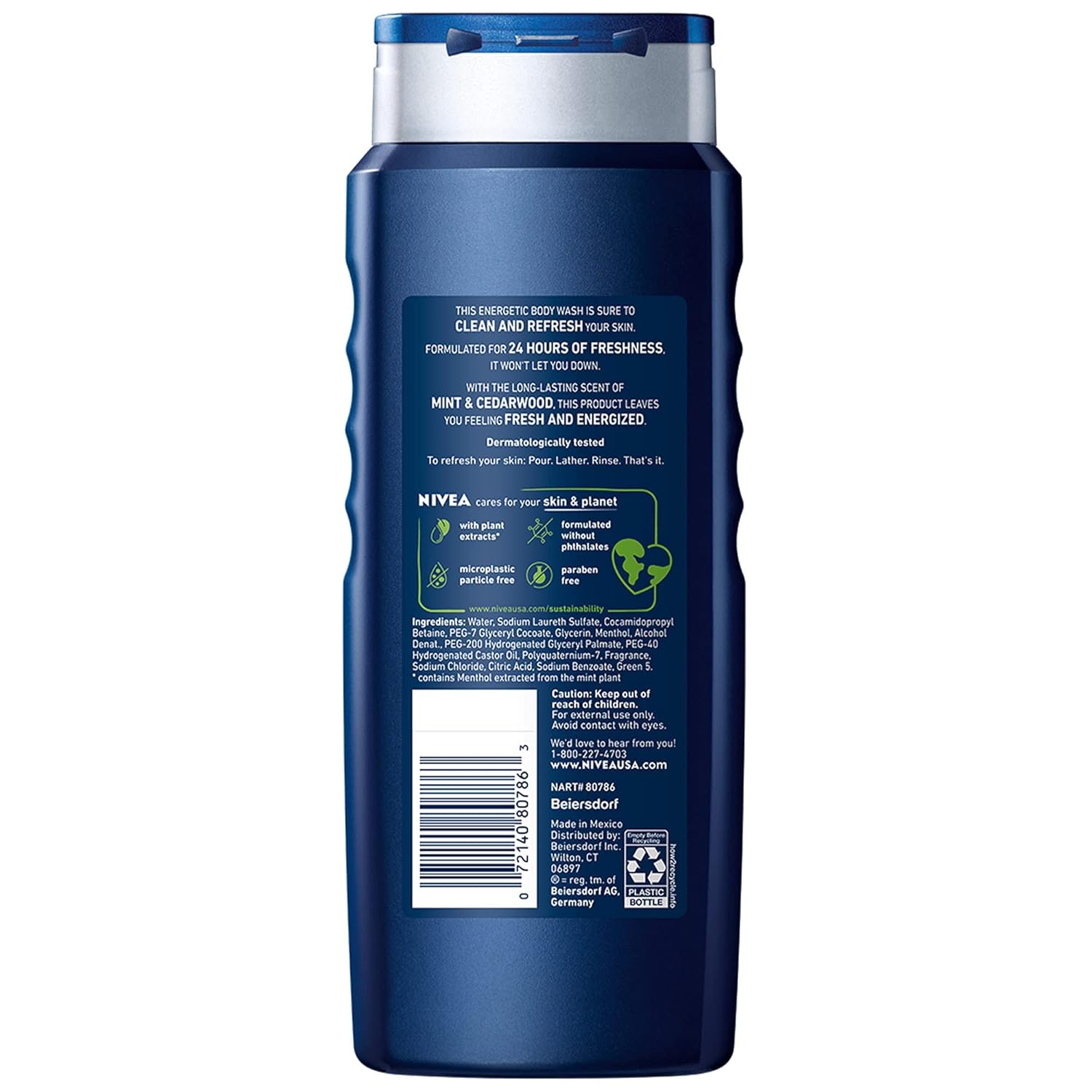 Start your day with an instant boost of freshness with NIVEA Men Energy Body Wash. Enriched with mint extract and infused with a cedarwood & mint scent, this refreshing 3-in-1 formula works as a body wash, face wash, and shampoo—keeping you clean and energized from head to toe.