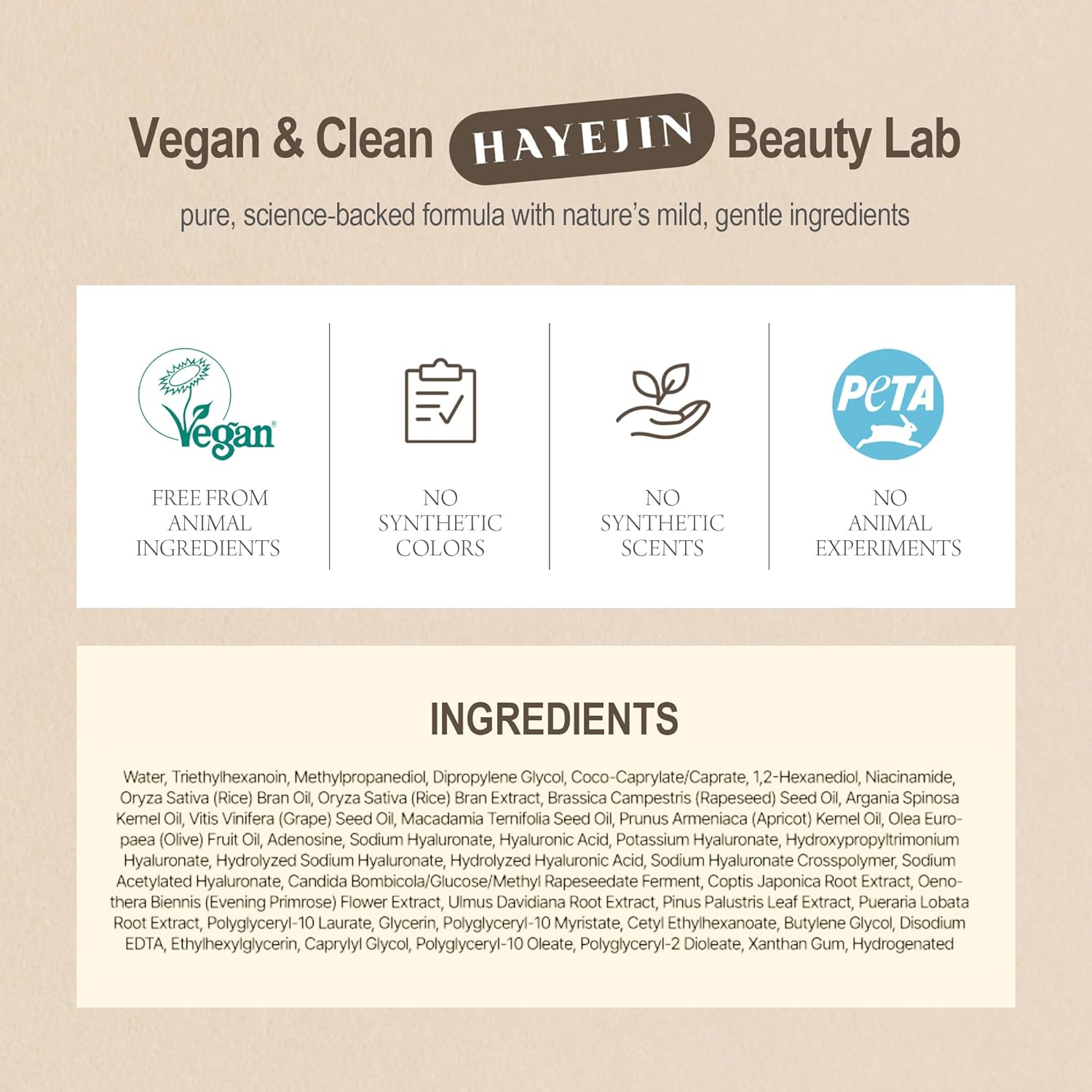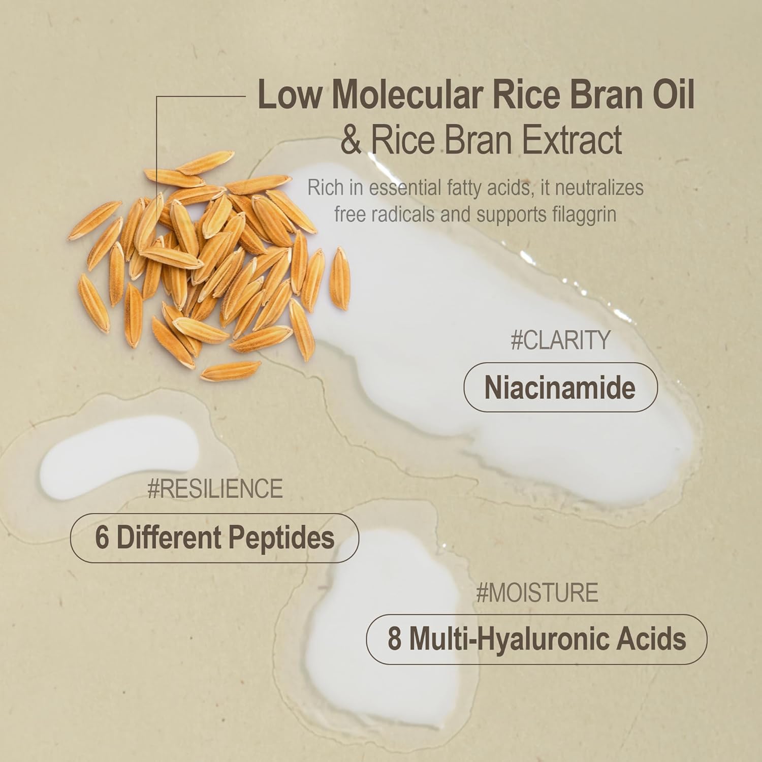 - Key Ingredients: Rice Bran Oil, Niacinamide, 8 Hyaluronic Acids, 6 Peptides, Argan Oil, Macadamia Oil