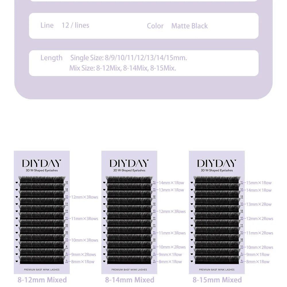 - 1 × Tray of DIYDAY W-Shaped Premade Eyelash Extensions (12 rows)