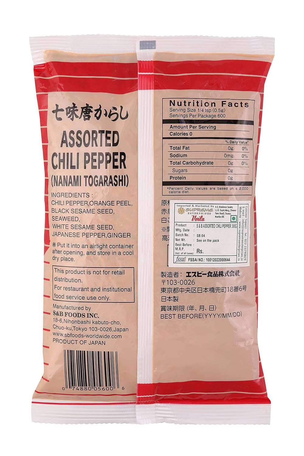 - S&B Assorted Chili Pepper features the rich aroma and color of a balanced blend of red chili pepper, orange peel, black sesame, white sesame, Japanese pepper, ginger and seaweed