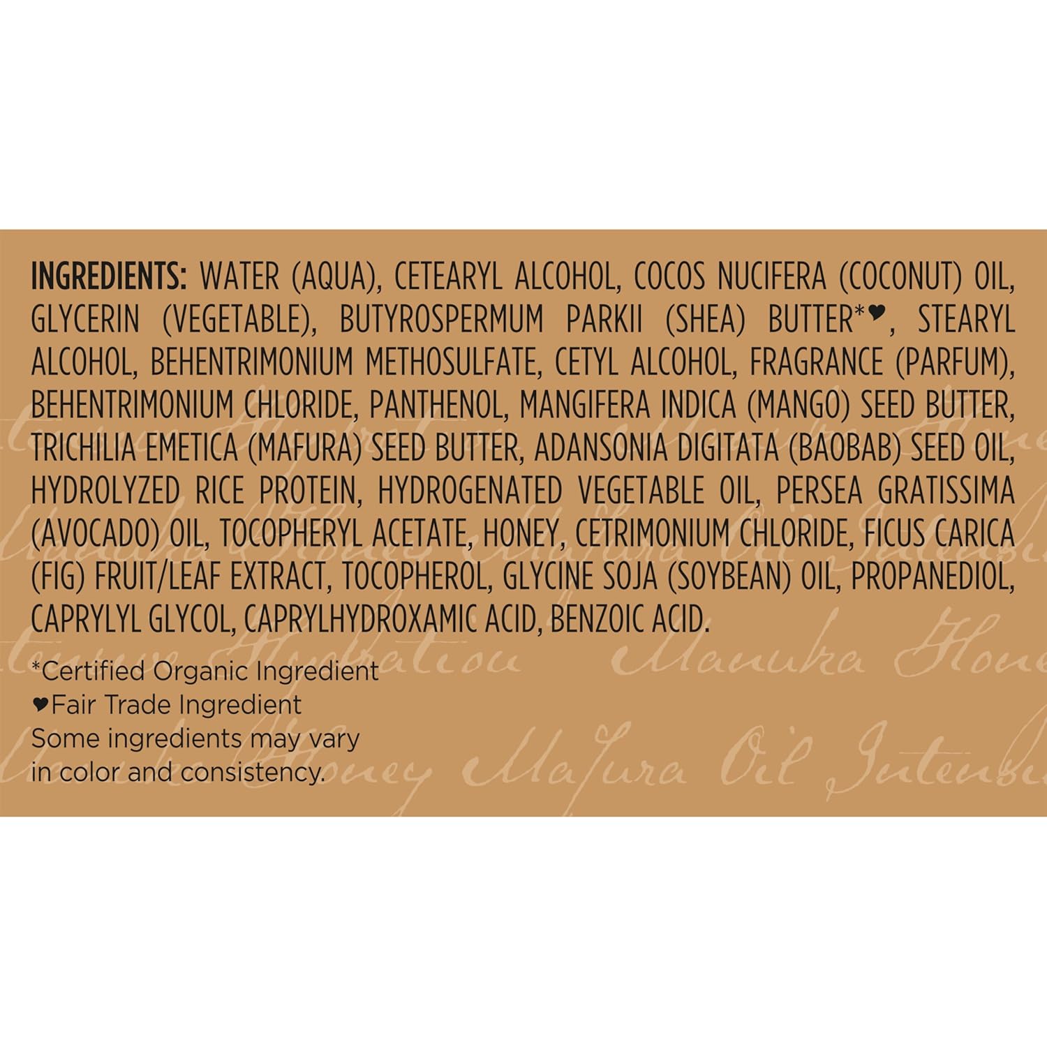 - Material Feature: Fair Trade Shea Butter, Fig Extract, Manuka Honey, Mafura Oil