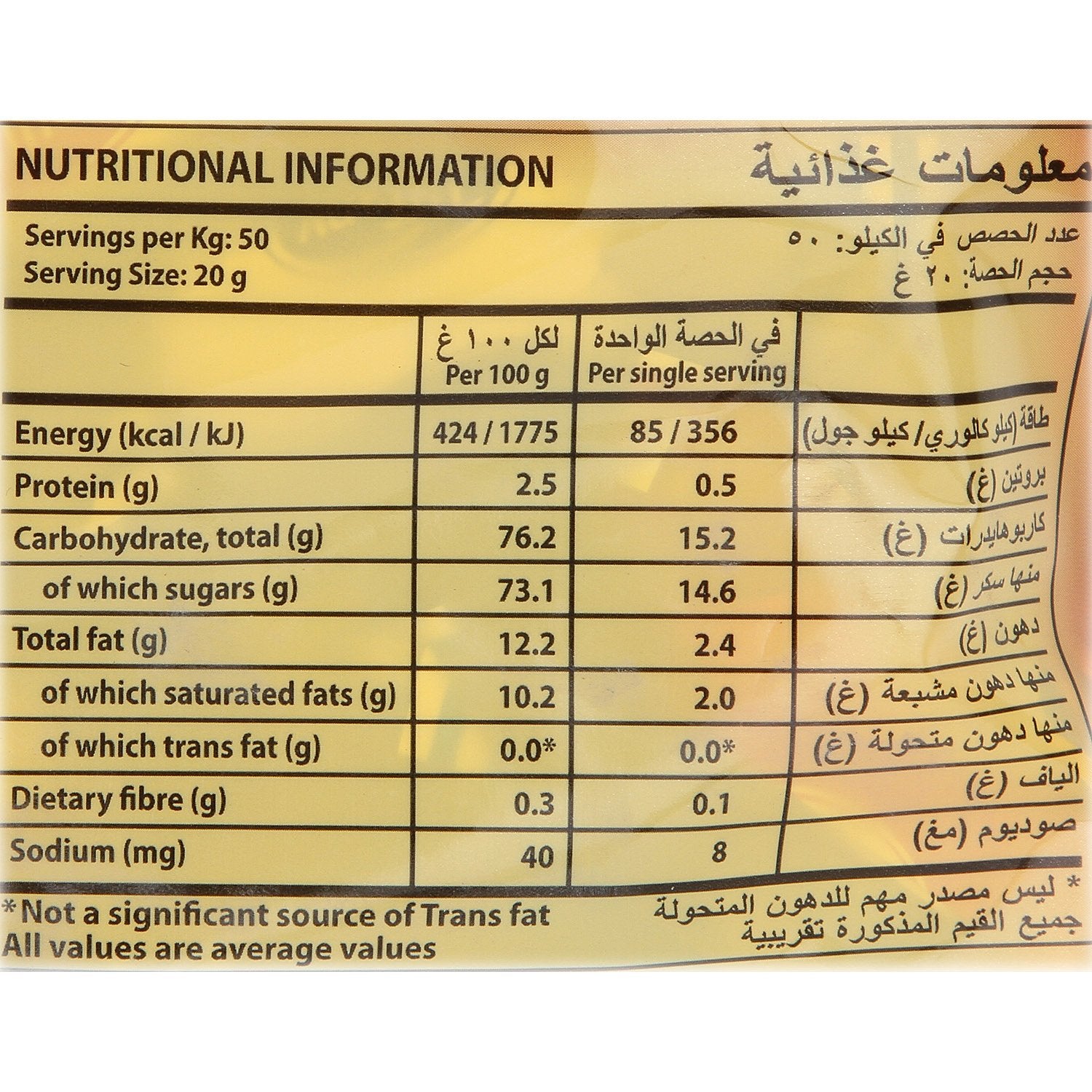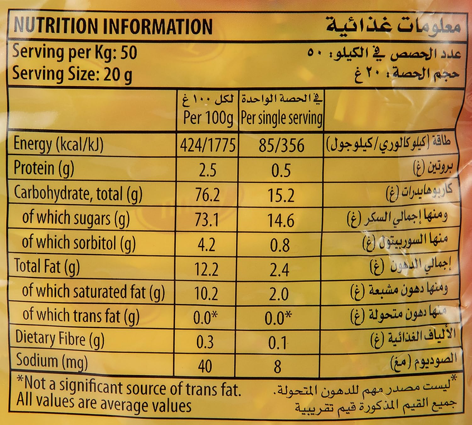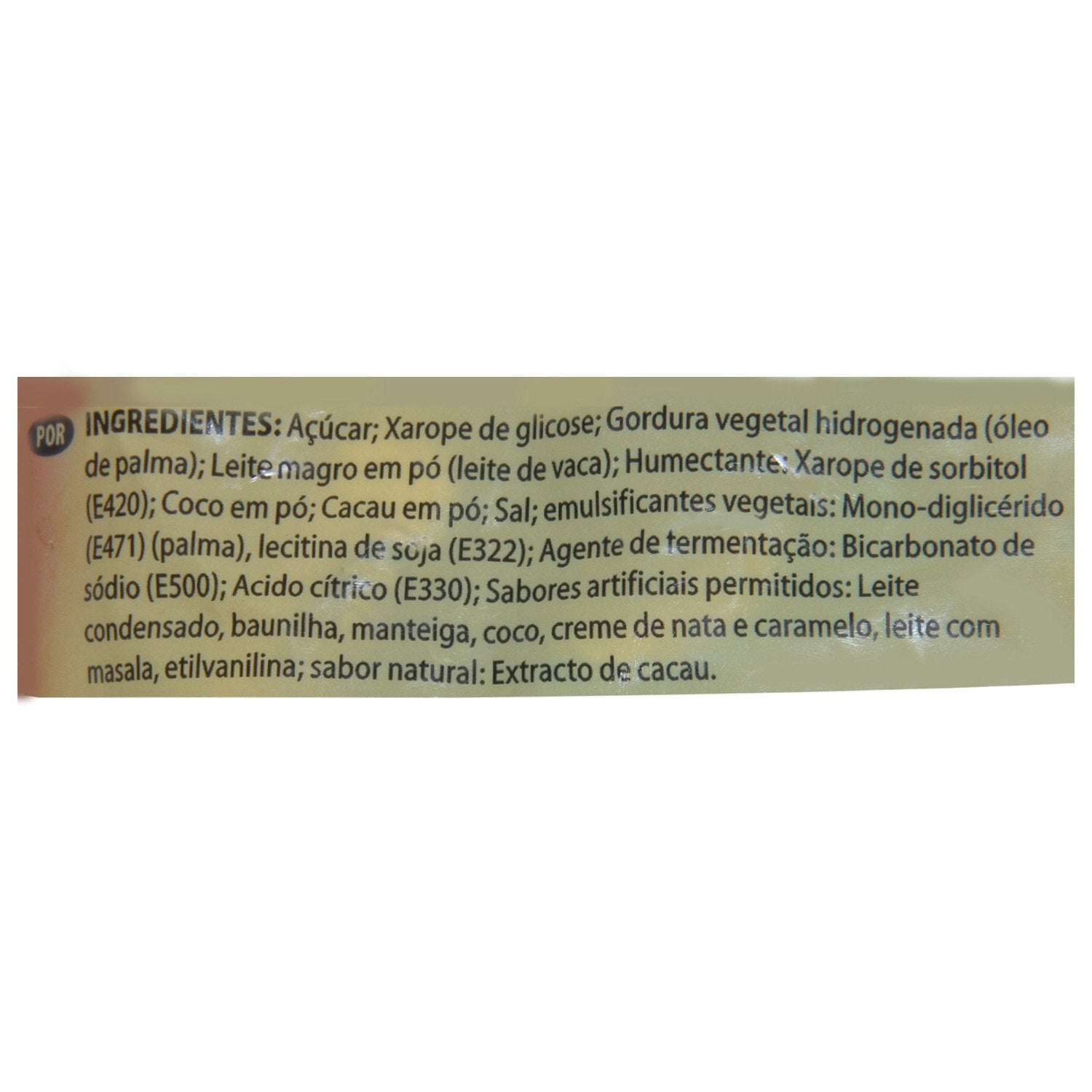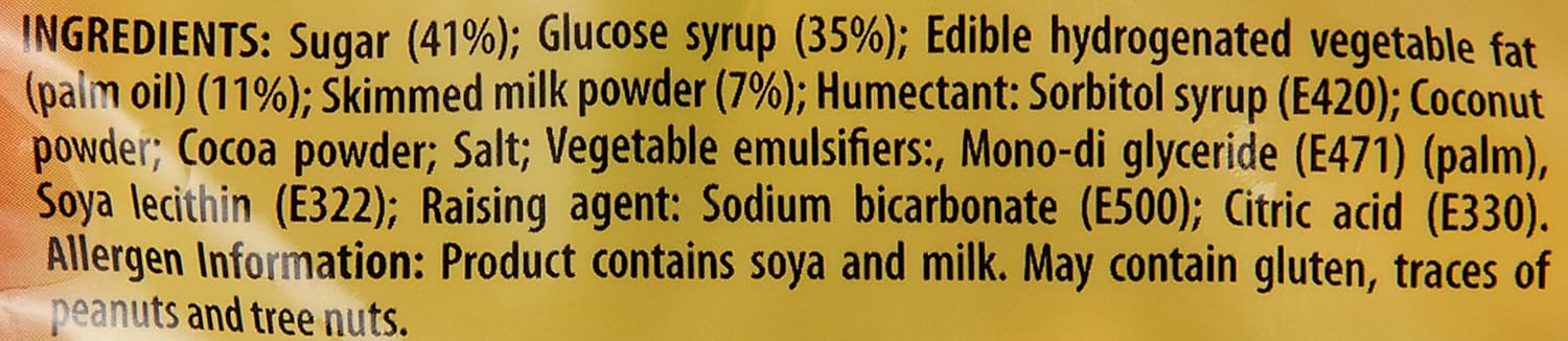 - ingredients:sugar (40%), glucose syrup (35%), fully hydrogenated vegetable fat (11%) (palm), dried skim milk (7