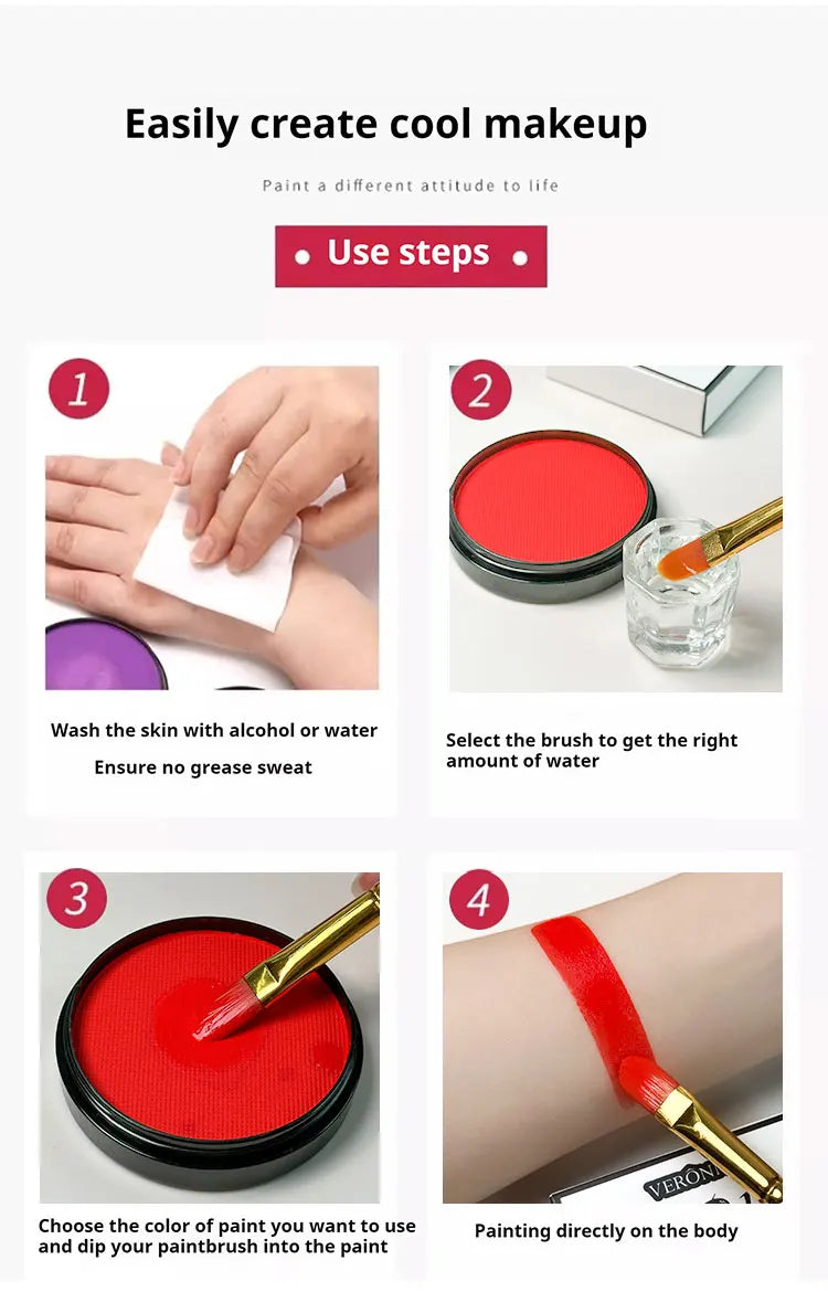 Unleash your creativity with this Monochromatic Water-Based Face & Body Paint Kit, featuring bold black, white, and red pigments ideal for Halloween, cosplay, Christmas, masquerade parties, and stage makeup. Each 30g color delivers rich, blendable coverage that's easy to apply, skin-safe, and water-soluble. Complete with brushes for precision detailing, this kit is your go-to for dramatic face art or full-body designs with minimal mess and easy cleanup.