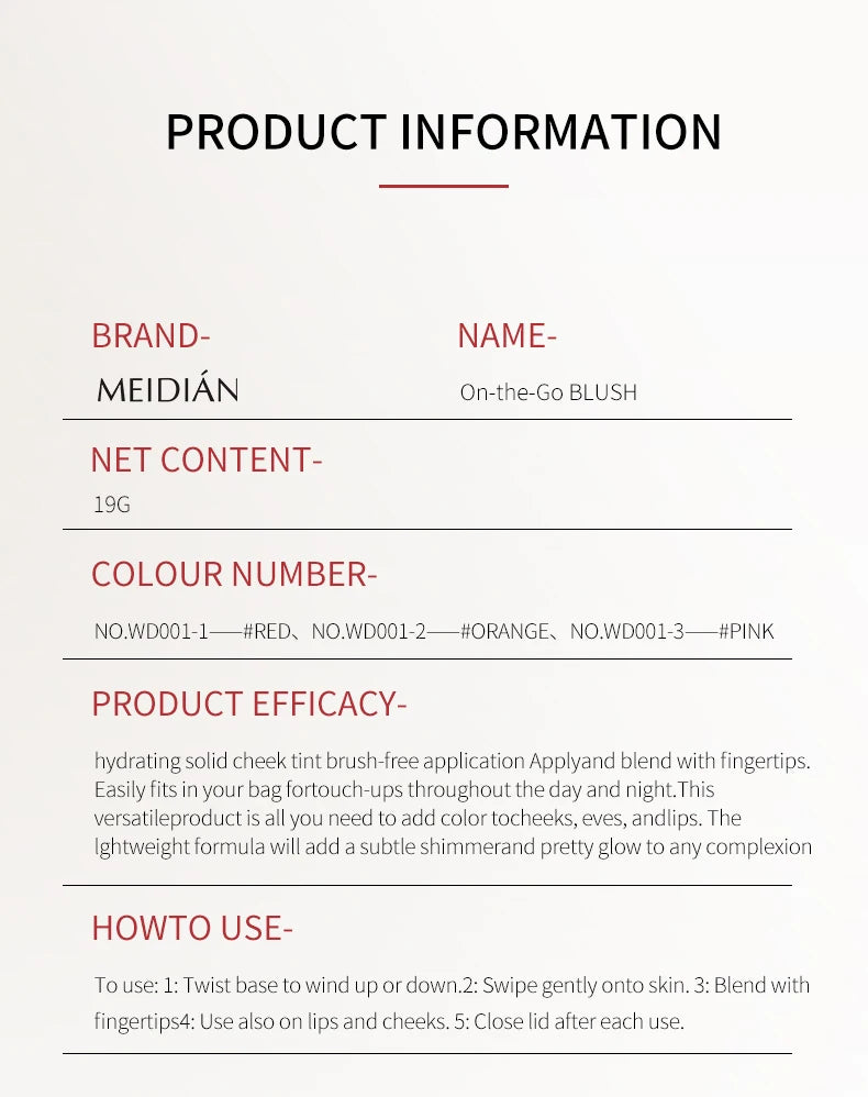 - Type: 3-in-1 Blush Stick (Blusher, Lipstick, Eyeshadow)