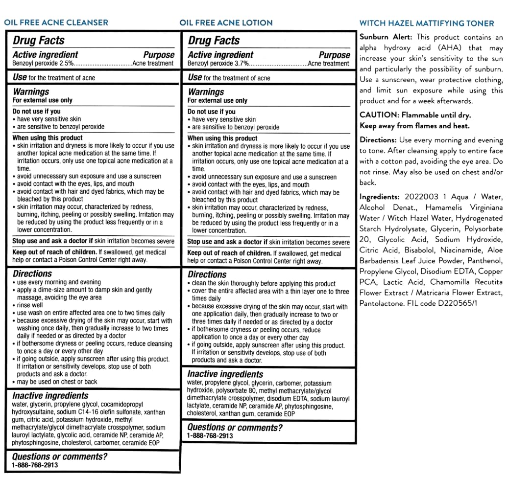 The 3-step system works around the clock: cleanse with the Oil-Free Acne Cleanser, balance with the Witch Hazel Mattifying Toner, and treat with the Oil-Free Acne Lotion. Visible results can be seen in as little as 3 days, helping restore confidence while maintaining your skin’s natural balance.