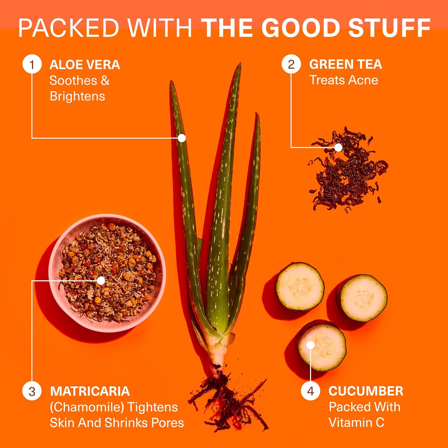 | Key Ingredients | Vitamin C, Cucumber, Green Tea, Aloe Vera, Matricaria |
