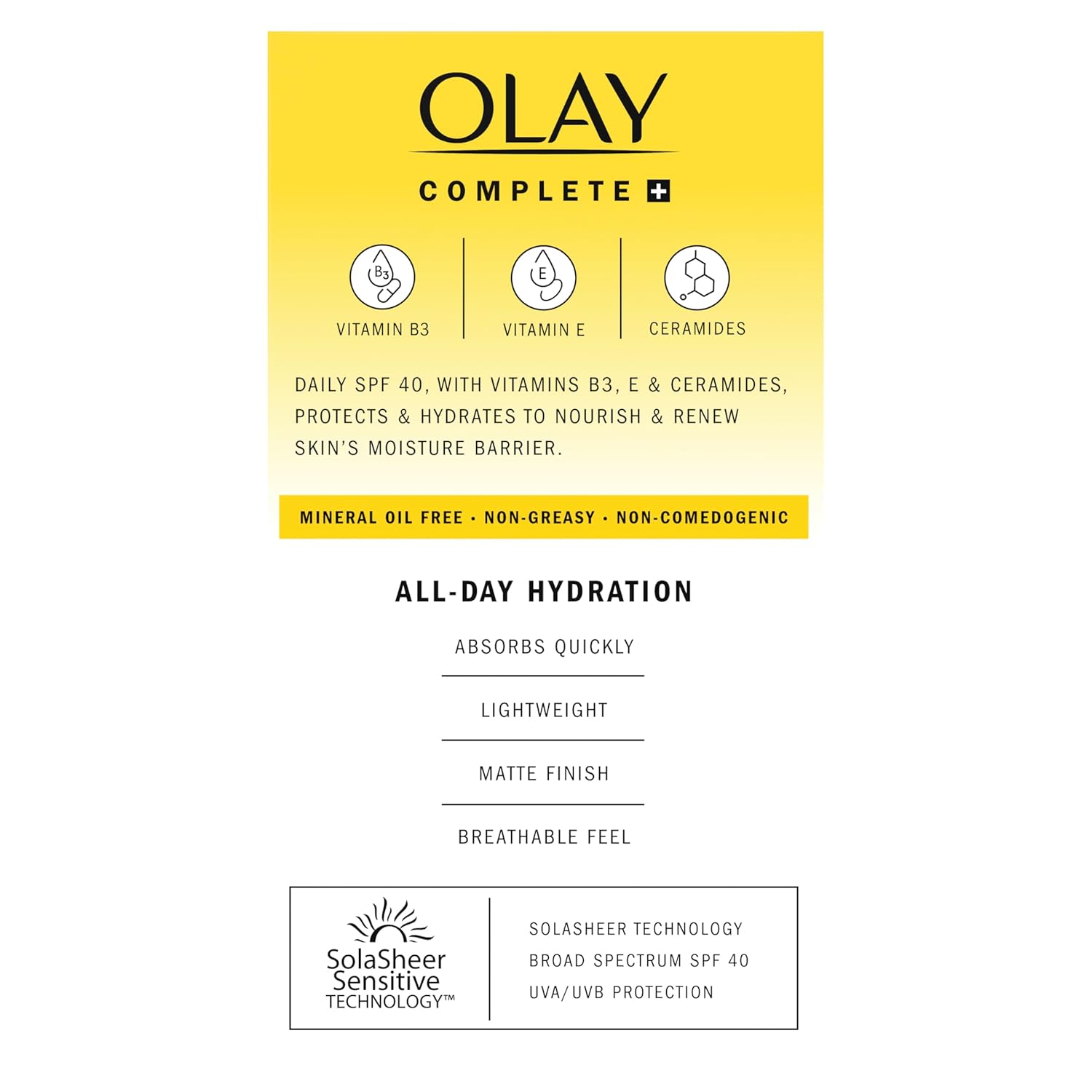 Olay Complete+ Moisturizer with Sunscreen SPF 40 | Fragrance-Free Face Lotion for Sensitive Skin | No White Cast, Lightweight, Vitamin-Enriched (6 oz)
