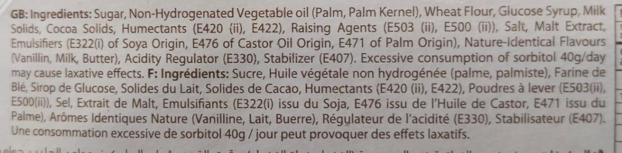 | Ingredients | Wheat Flour, Sugar, Vegetable Oil, Caramel, Milk Solids, Cocoa, Chocolate, Soy Lecithin, Salt, Leavening Agents, Flavouring Substances |
