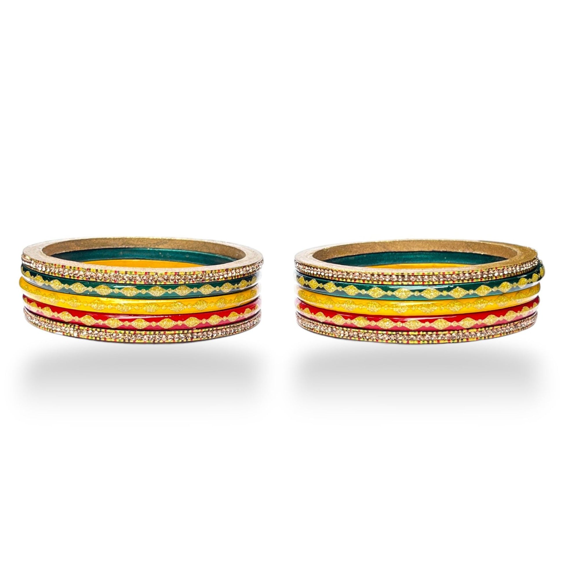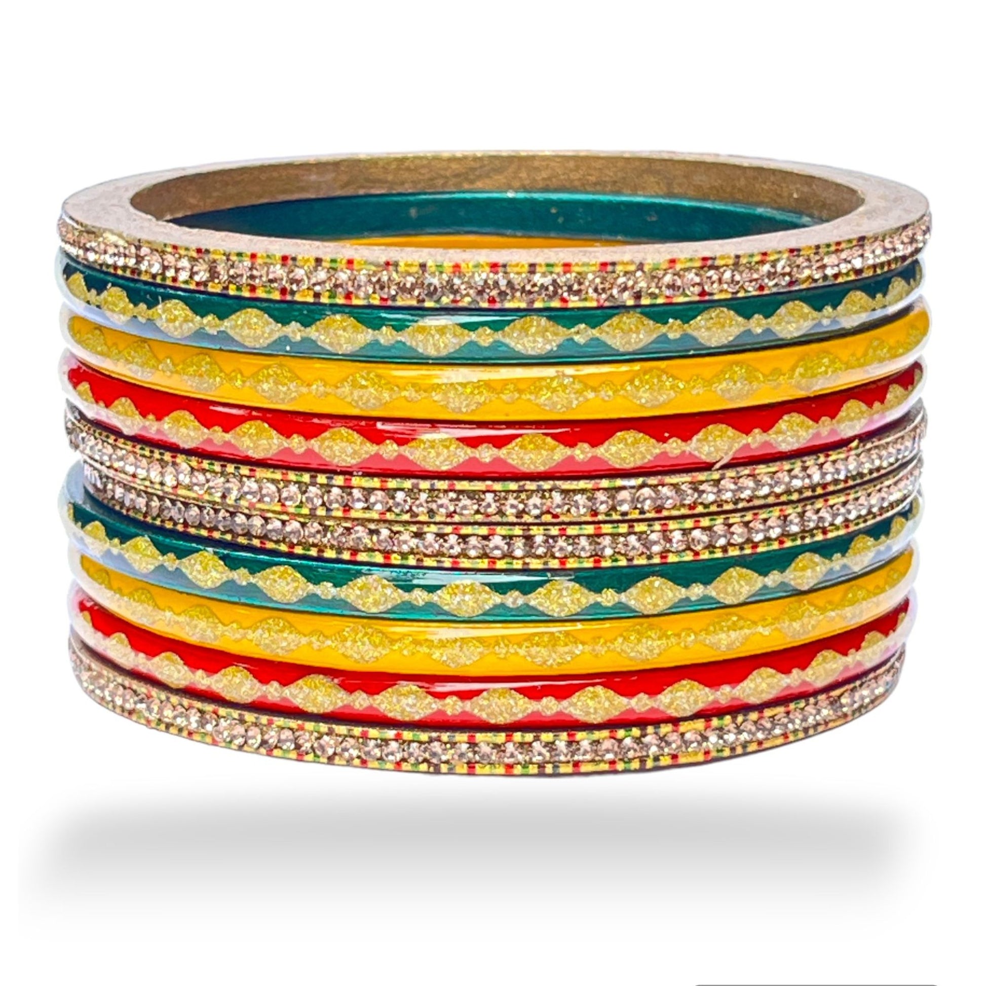 LuxuryGlow Lac Bangle Luxe Set – Handcrafted Red, Green & Yellow Gold-Plated Bangles with AD Stones