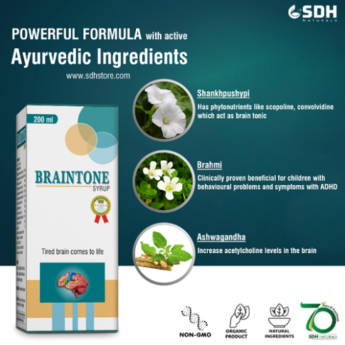 Braintone Syrup helps improve alertness, concentration, and attention while supporting stress management and relaxation. It is also commonly used to support calmness and better sleep quality as part of a holistic Ayurvedic wellness routine.